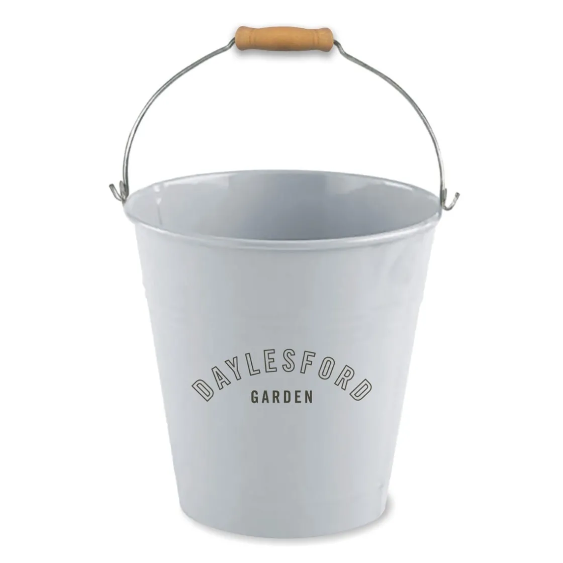 This steel-coated metal bucket has a wooden handle for easy carrying and is decorated with the Daylesford garden logo.