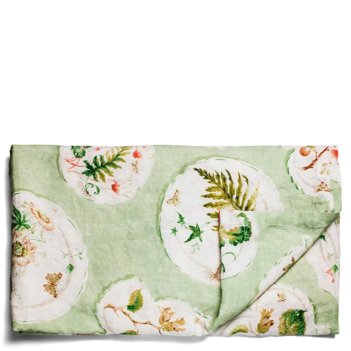 Dress your table with this pure linen tablecloth featuring colourful flowers on a pale green backdrop, inspired by the botanical designs of 18th century antiques.